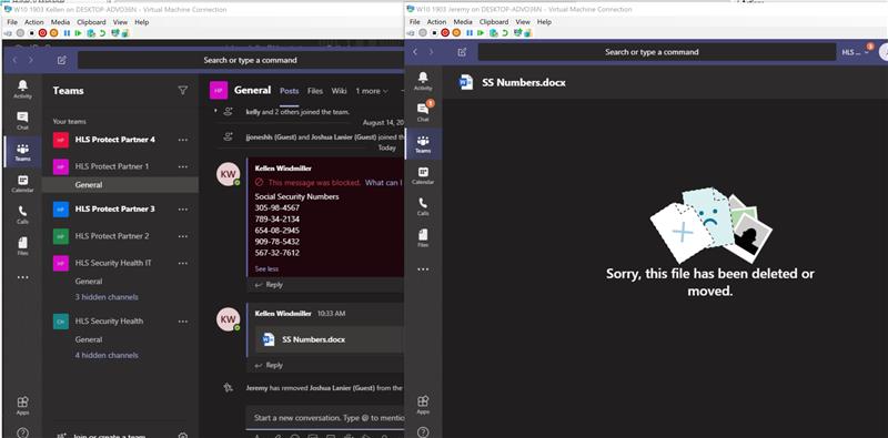 Just like the scenario above where employees may try to post sensitive text in a chat they may try to upload a document containing sensitive data. To help control this scenario I have built out a policy in Microsoft Cloud App Security (MCAS) that will quarantine the file from being shared with other employees due to the sensitive content.
