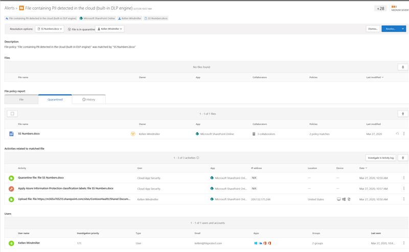 With the MCAS policies an IT/Security admin can get detailed information on why the file was quarantined.
